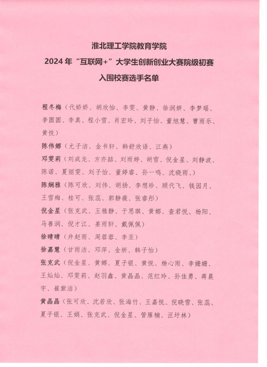 PP电子游戏网站2024年“互联网+”大学生创新创业大赛院级初赛入围校赛选手名单