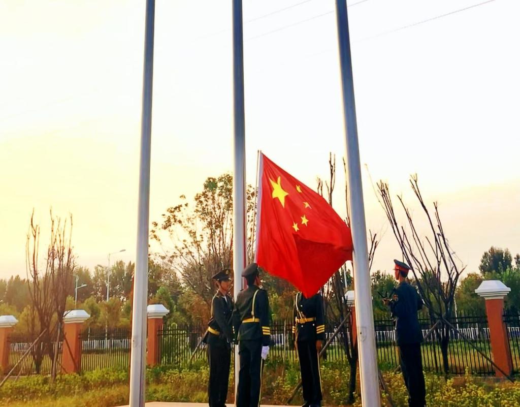 升旗方阵整装待发,动作整齐划一,踏步刚劲有力。伴随着《义勇军进行曲》,升旗队员迈着铿锵有力、整齐划一的步伐向着升旗台进发,以最庄严的姿态面对国旗,全体师生注视着五星红旗冉冉升起。