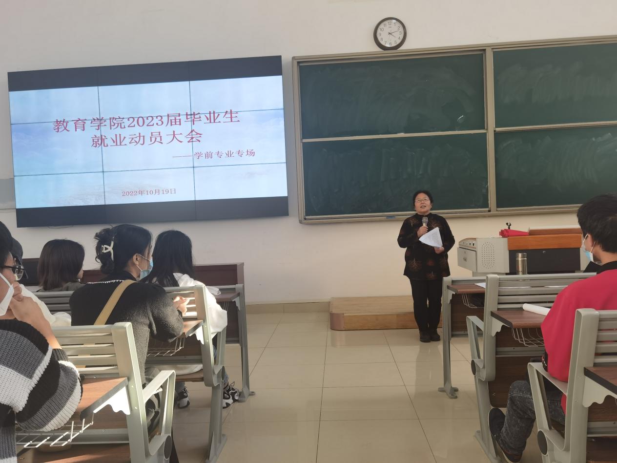 2022年10月19日下午,我院在教学楼121教室召开2023届毕业生就业动员大会。为帮助2023届毕业生准确有效地确定就业方向,尽快地让同学们在思想、行动上早做准备,指导毕业生如何走好从大学走向社会的重要一步。PP电子游戏网站王家云院长、孟向红副书记及学前教研组老师出席本次会议,2023届PP电子游戏网站学前教育专业全体毕业生参加会议。会议分两场进行,分别由PP电子游戏网站学前教育专业辅导员任若晨、侯莉萍主持。