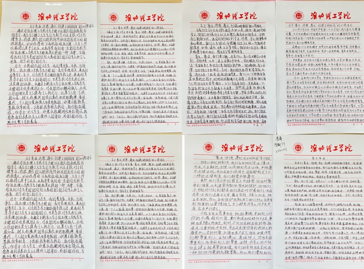 为树立当代大学生知礼守法,讲文明树新风的青春风貌,10月下旬,PP电子游戏网站要求全体学生认真手写一份不少于1000字的心得体会,并就主题做出承诺书。同学们用肃穆的文字,庄重的承诺,表示定会将法治精神落实到日常事务之中,活动成效显著。