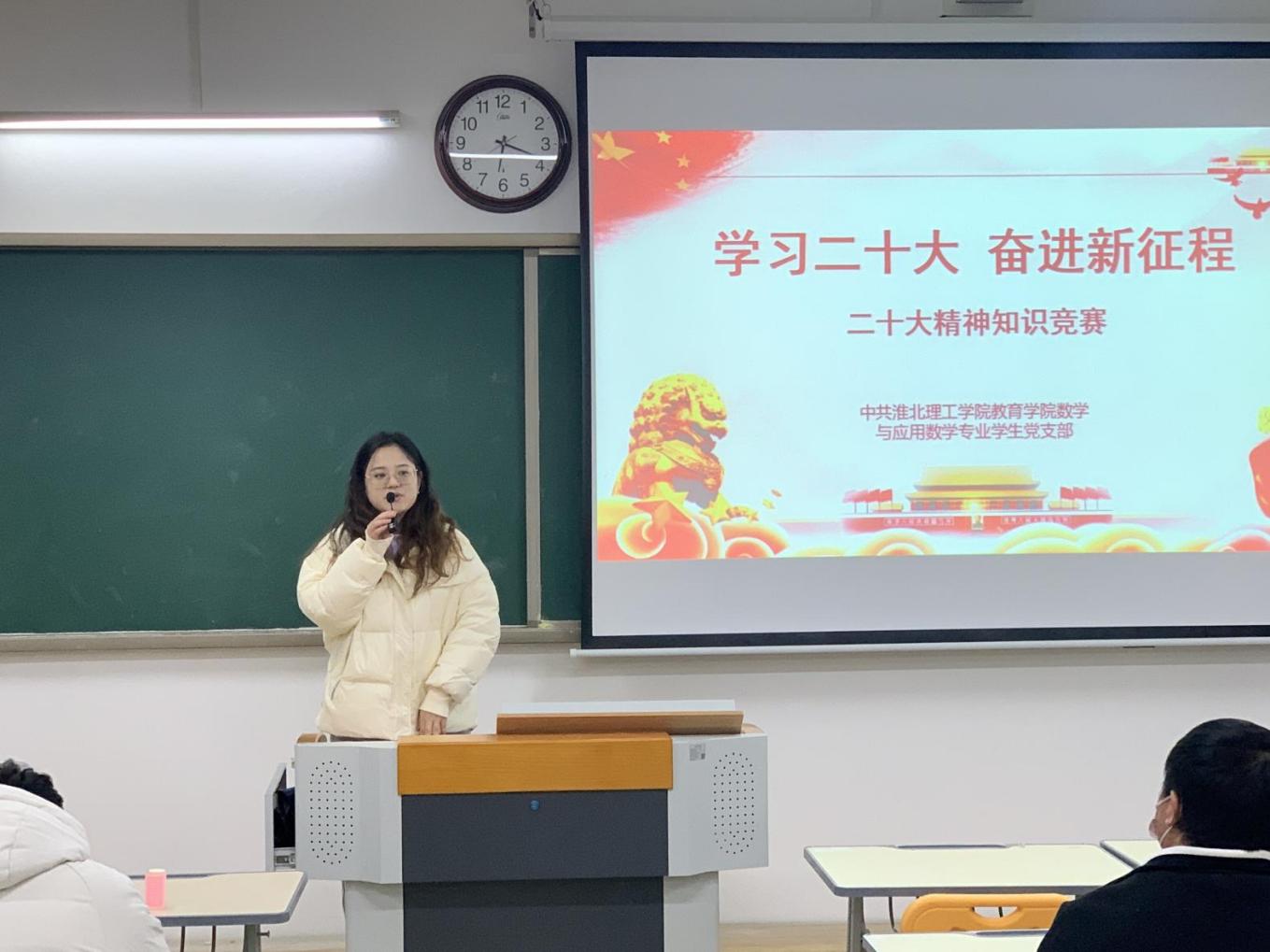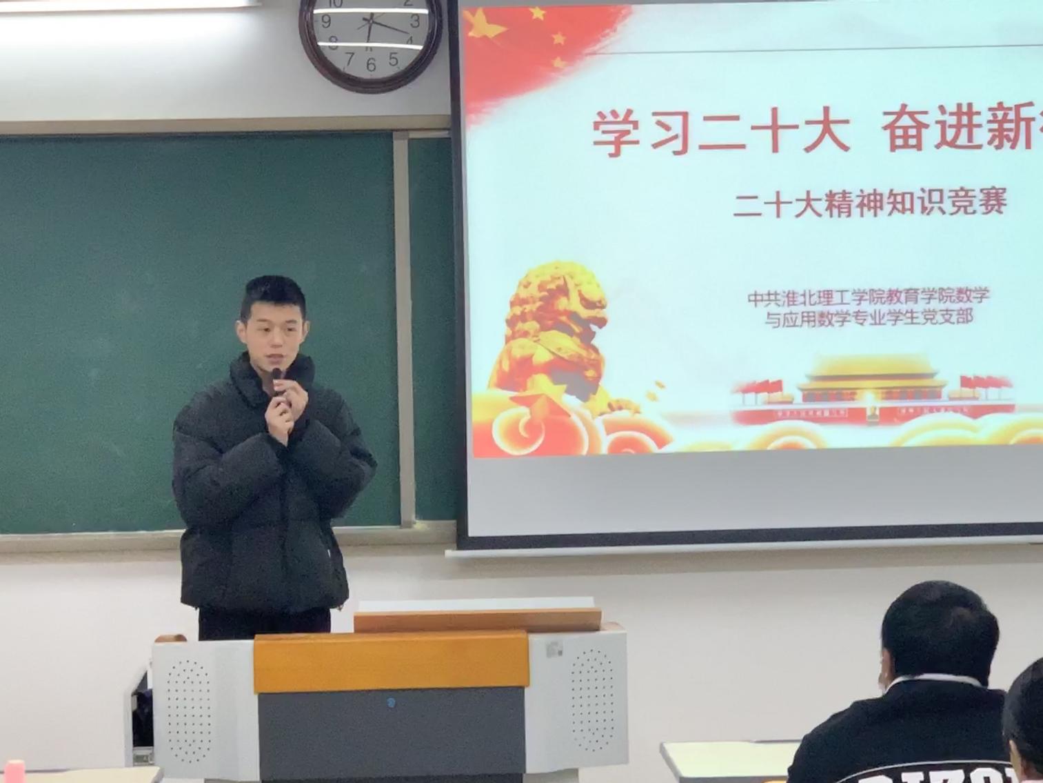 为深入学习宣传贯彻党的二十大精神,回顾党的光辉历史,推动党的二十大精神落地生根、入脑入心。PP电子游戏网站数学与应用数学学生党支部积极部署,于12月1日在1教313开展“学习党的二十大精神知识竞赛活动”,活动由支部委员孙虎主持,支部书记陈媛媛、全体支部党员及入党积极分子参加了活动。