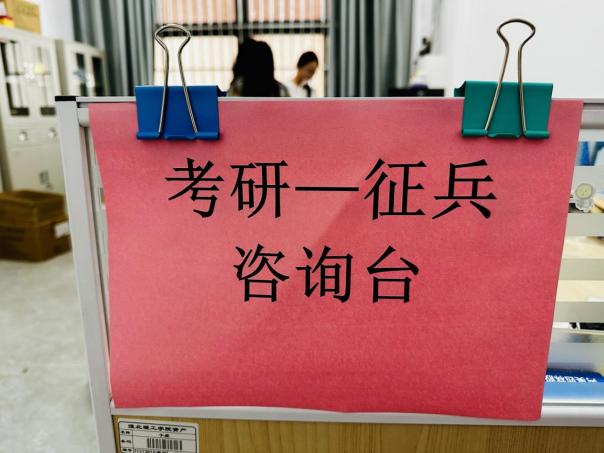 动员会后,学院在艺术楼106办公室设置“考研-征兵咨询台”,郭鸿鑫老师对前来咨询的同学一对一进行答疑、讲解,做到服务周到、答疑精准。截止目前,2026届数学专业毕业生已有10余名学生意向参军入伍,并进行线上兵役登记。