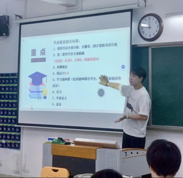 郭鸿鑫老师通过具体数据向同学们介绍了我院2025届数学专业毕业生考研、考公及参军入伍等方面情况:2021级数学专业考研录取17人,学子分别被安徽工程大学、淮北师范大学等高校录取,考研录取率达到10.37%,2名学子投身军营,1名学子录取西部计划,2人成功考取事业单位。郭鸿鑫老师在会议中强调:“这些数字背后是清晰的规划与脚踏实地的努力”。他希望2026届毕业生既要坚定理想,以充足饱满的劲头投入研究生备考工作中,也要脚踏实地,借力学业资源找准个人规划的精准定位。在2025届毕业生出色成绩的基础上,我们要继续拼搏,把就业、考研、征兵工作做实做细,创造属于我们的新成绩。