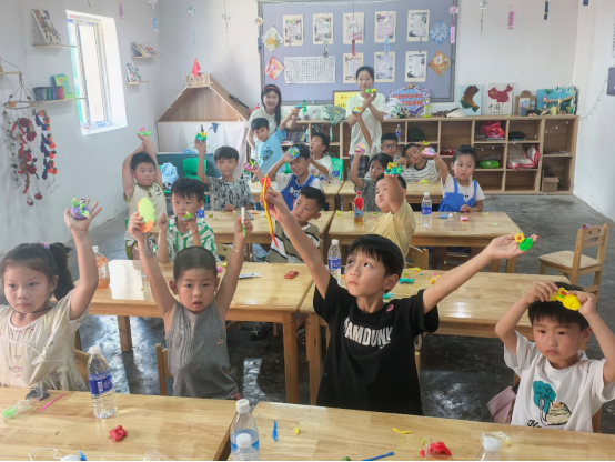 下午的课程是丰富多彩的手工粘土课。课程以向日葵为主题展开,支教团成员们引导孩子们用粘土塑造向日葵的形态,在提升小朋友们的动手能力和想象力的过程中,还结合手工作品传递了积极向上的生活态度。同时,还融入了非遗文化等相关内容,让孩子们在实践中收获非遗知识,传承红色文化。