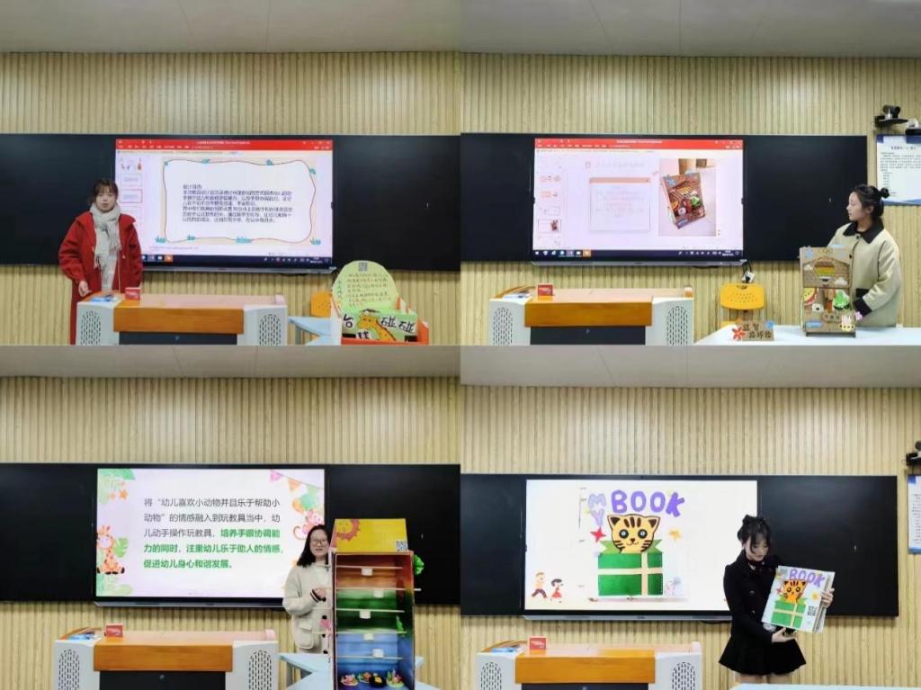 在比赛过程中,学前学子创造性地利用包装盒、纸板、饮料瓶、废树枝等自然废旧材料制作出符合幼儿生长需求、支持幼儿发展的各种玩教具。每位学子结合自身研究兴趣,找准设计方向,理清设计思路,用一双巧手绘制图纸,精心选材,认真制作,并用PPT解说的方式讲解制作过程。一份份创意十足的作品处处彰显着“准教师”们的教育情怀,充分展现出他们勇于创新的职业精神。