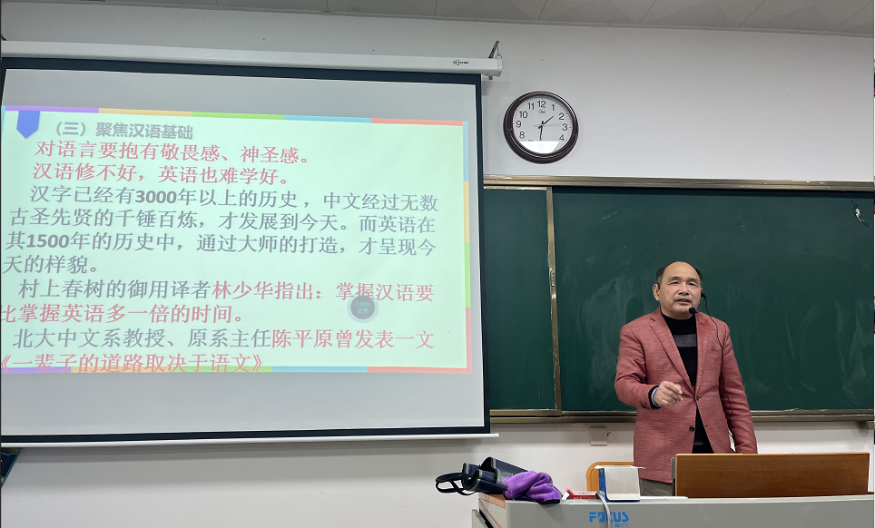 叶小宝教授拥有数十年的英语教学与研究经验,虽已退休,但仍心系课堂,育人热情不减。讲座中,他结合自己丰富的教学实践,从“课堂教学设计艺术”、“如何激发学生自主学习兴趣”以及“英语教学的重点难点”三个维度,进行了深入浅出的分享。叶教授语言风趣幽默,案例生动详实,其“以语法为核心,以语块为重点”的教学理念和充满教育智慧的教学方法,赢得了在场教师的阵阵掌声。