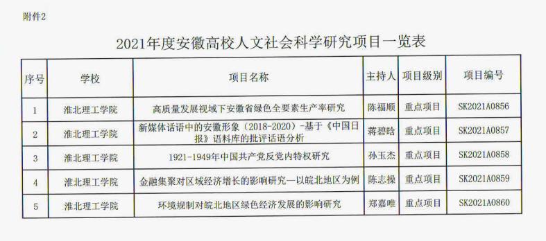 祝贺我院蒋碧晗老师获批2021年度安徽省高校科学研究重点项目(哲学社会科学类),王伟杰老师、段博韬老师获批2021年度安徽省高校科学研究重点项目(自然科学类)。现予公示!具体详细名单请见附件!
