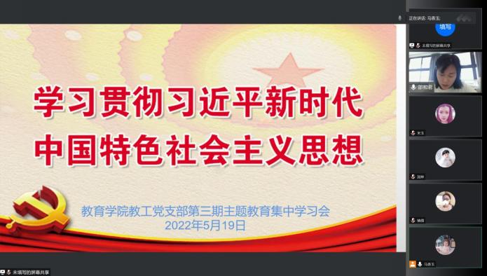 5月19日中午,PP电子游戏网站教工党支部为了学习贯彻习近平新时代中国特色社会主义思想主题教育,开展第三期读书班集中学习会,本次学习会以“线上课堂”形式举行,由教工党支部委员邵和君同志主持并领学。