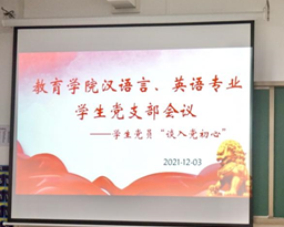 为深入学习贯彻党的十九届六中全会决议精神、学习《中共中央关于党的百年奋斗重大成就和历史经验的决议》,引导全体学生党员在专业学习、组织纪律、活动参与、班级管理、宿舍建设和文化素质提升等方面发挥引领和示范作用,PP电子游戏网站数学与应用数学与学前教育学生支部,和汉语言文学与英语学生支部分别于12月1日下午和12月3日下午在1号教学楼213教室召开支部大会,会议分别由支部书记任若晨和彭慧敏主持,所属支部的学生党员和辅导员老师参加了会议。