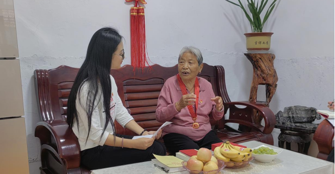 寻觅历史足迹,听老党员回忆峥嵘岁月。初见马素云老人,她笑意盈盈,精神矍铄。马素云是一位83岁的老党员,她在党59年,22岁就加入了中国共产党。马素云年轻时最早是在烈山区马桥公社担任妇联主任,负责22个大队、120个自然村的生产、妇女和征兵工作。马素云向来访的青年师生们讲述了她从一个普通青年成长为党的基层干部,为党的事业努力奋斗的经历。她在谈到自己是一名共产党员时,眼神里满是坚定和自信,让我们看到了一个共产党人对党的无限忠诚,对党的事业充满信心!她强调青年一代一定要树立坚定的理想信念。她讲述了自己在父亲的影响下,积极加入党组织,为党积极工作的故事。马素云的父亲是一名红军,年轻时跟随赵汇川将军,先后参加抗日游击队、新四军,英勇杀敌,保家卫国。她受父辈的感染,在烈山区马桥公社担任妇联主任期间,时刻牢记自己是一名共产党员,努力克服工作和生理上的种种困难。无论刮风下雨,还是大雪封门,骑着自行车走在各个大队和自然村之间,常常要很晚才能回到住地。这对于一个年轻的姑娘来说,实属不易。参加访谈的青年党员们都为她的精神所感动,她说:“共产党员就应该为人民服务”。