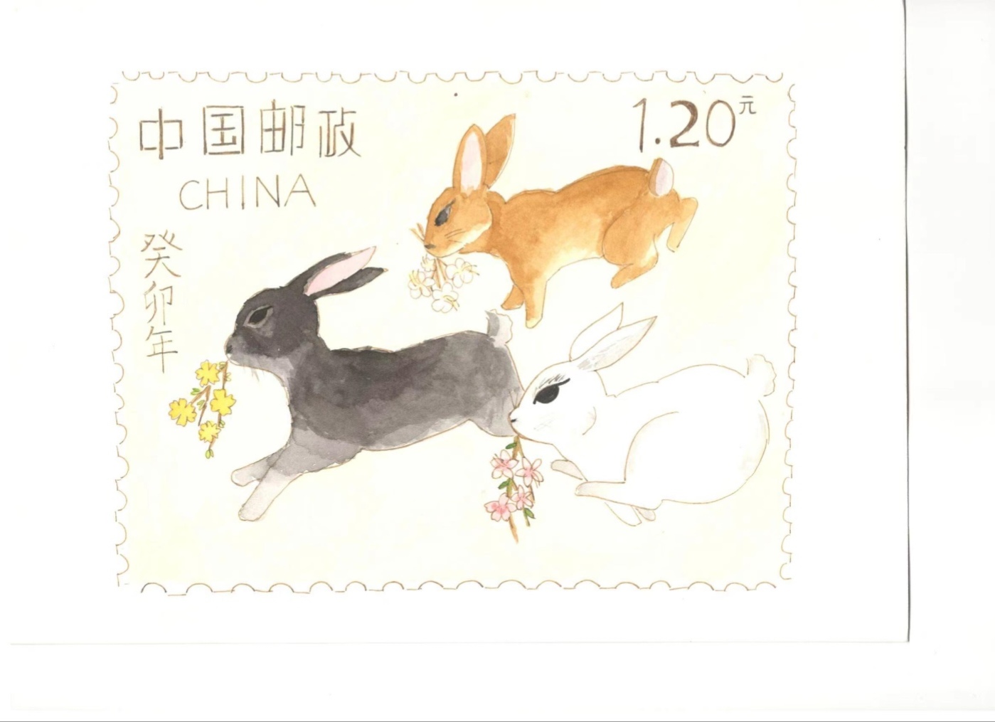 介绍:我的作品是以汉字兔为构想基础,将绘画与汉字融合。契合了兔子娇小的身材特点,将兔字中点化成兔子。同时,邮票设计采用黑白是想符合中国传统水墨丹青的特色,符合比赛主题。