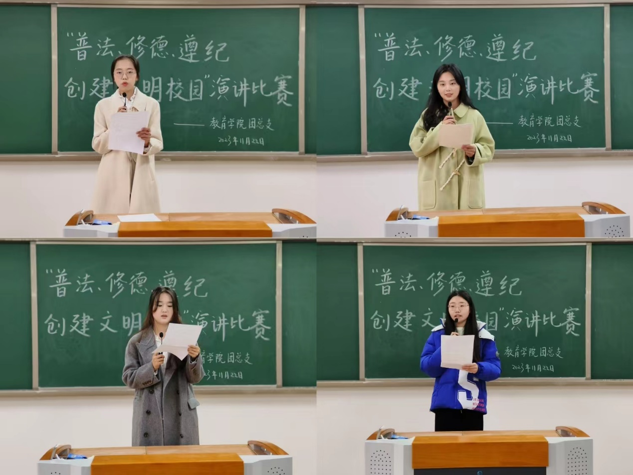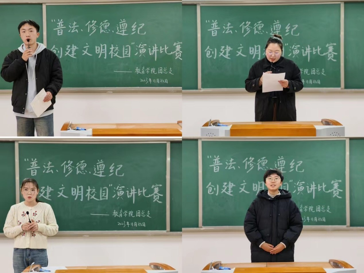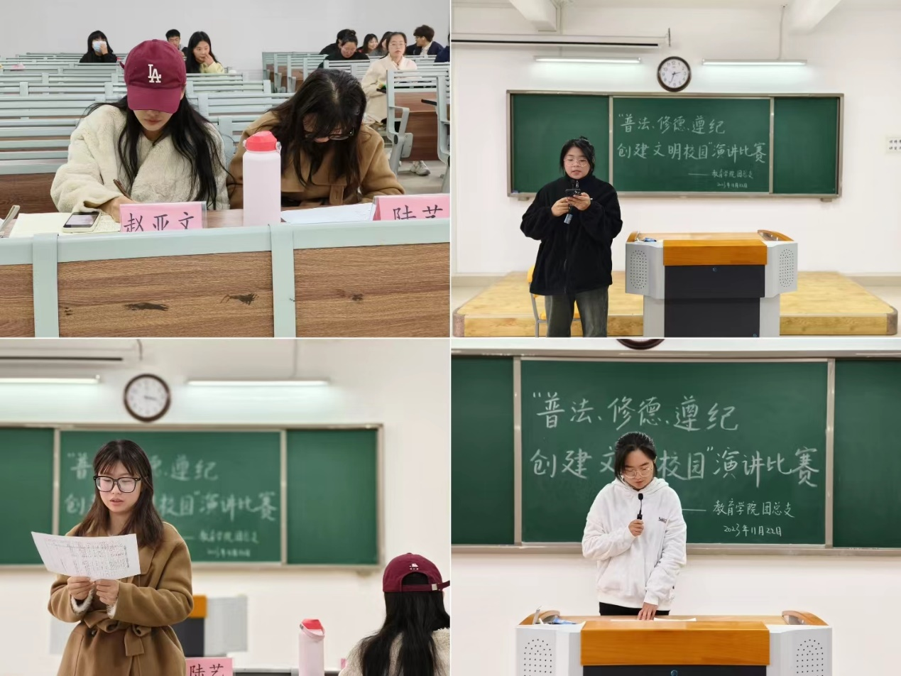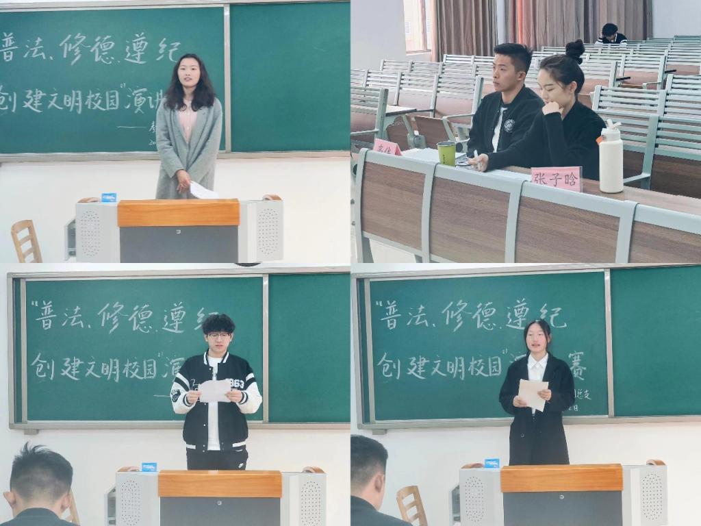 为落实学校《关于开展2023年“普法、修德、遵纪,创建文明校园”专项活动的通知》精神,提高同学们的法律意识,大力弘扬法治精神,创建学风校风优良的文明校园,PP电子游戏网站于11月22日下午在2号教学楼412、413、414、415、416教室分别开展以“普法、修德、遵纪,创建文明校园”为主题的演讲比赛。学院2023级辅导员老师担任评委。