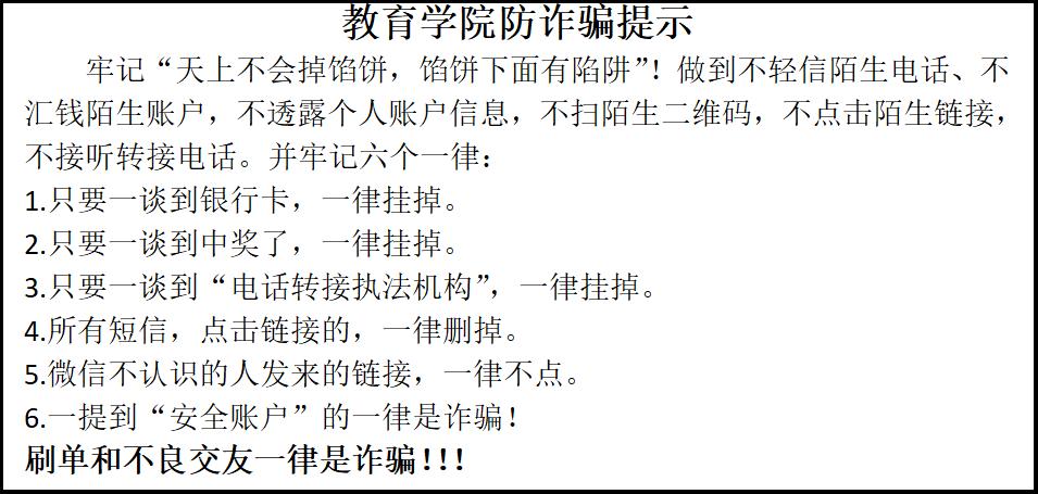 本次主题教育活动,希望同学们从思想深处树立防范诈骗的意识,增强防诈反诈的敏感性和辨识度,提高防诈反诈能力,共同维护校园的文明安全稳定。