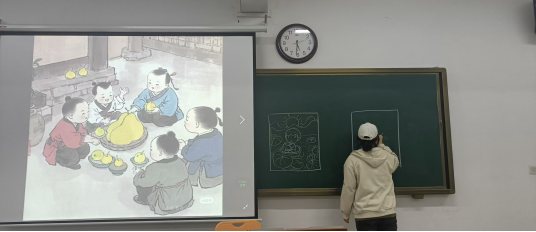 同学们以“你画我猜”的游戏形式,将传统文化符号表达为幼儿易于识别和理解的有趣图画,同学们用彩色粉笔在黑板上绘制“年兽故事”“孔融让梨”等文化主题简笔画,通过童趣视角解读画面内涵,苏可可、樊悦悦同学画的‘猴子水中捞月亮’,不仅能直观地让孩子们猜到故事,更引导了小朋友们懂得观察与思考。“你画我猜”玩转了文化符号,游戏既考验文化理解力,更能锻炼幼师必备的简笔画与叙事能力,活动现场欢笑声中碰撞出“传统文化儿童化”的多元创意。