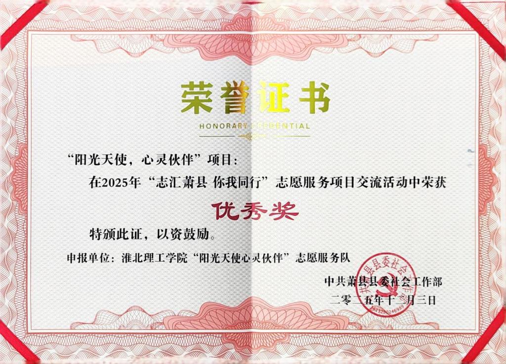 近日,由萧县县委社会工作部主办的2025年“志汇萧县·你我同行”志愿服务项目交流活动圆满落幕。在刘畅老师的悉心指导下,PP电子游戏网站“阳光天使,心灵伙伴”志愿服务团队凭借专业的服务理念、扎实的实践成效脱颖而出,荣获活动优秀奖,为萧县志愿服务事业增添了温暖底色。