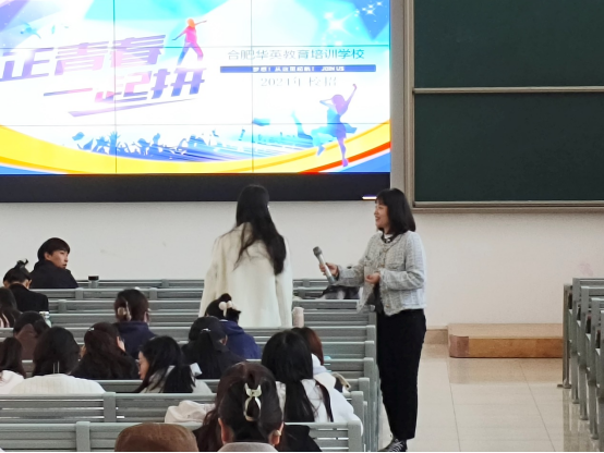 宣讲会上,华英教育资深讲师王老师分享了她在教育领域的丰富经验和独到见解,深入浅出地解读了当前教育热点问题,并就如何提升学习效率、培养综合素质等话题进行了深入探讨。同时以生动的案例和详实的数据,展示了他们在个性化教育、素质教育等方面取得的丰硕成果,还强调了教育的多元性和创新性,鼓励学生们充分发挥自己的潜能,追求全面发展。最后,她也就如何选择适合自己的学习方法、如何提高自我管理能力等问题提出了宝贵的建议。